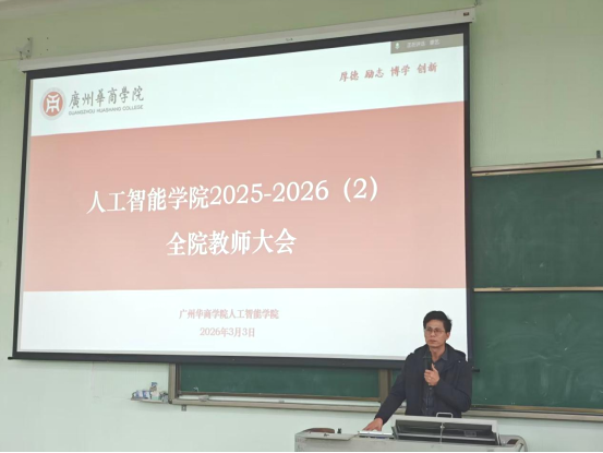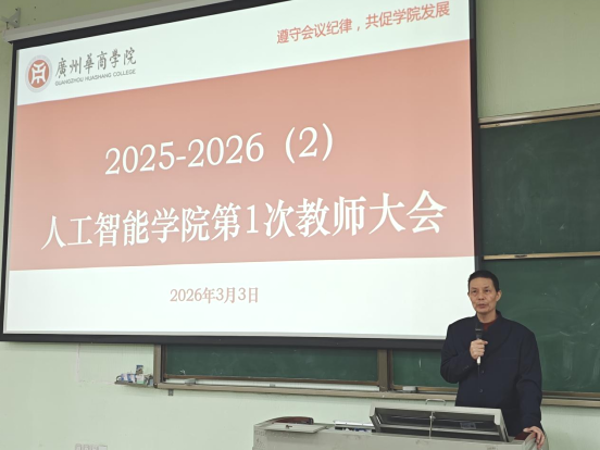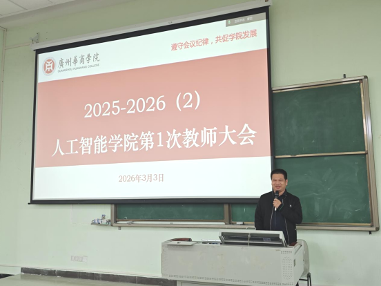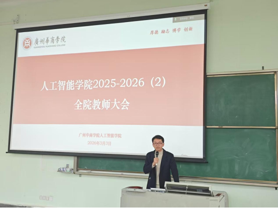 叶仕通副院长代表学院作2026年重点工作部署。他从师资培养、教学管理、科研创新、产教融合等方面系统梳理了年度任务。他强调,各项工作要紧密围绕合格评估指标体系,落细落实、闭环管理。在教学管理方面,他重点通报了开学首日的课堂教学检查情况,要求全体教师切实加强课堂管理,提升教学质量。